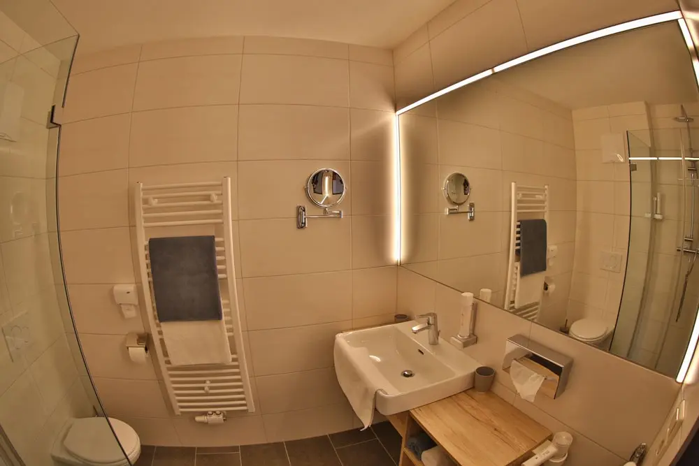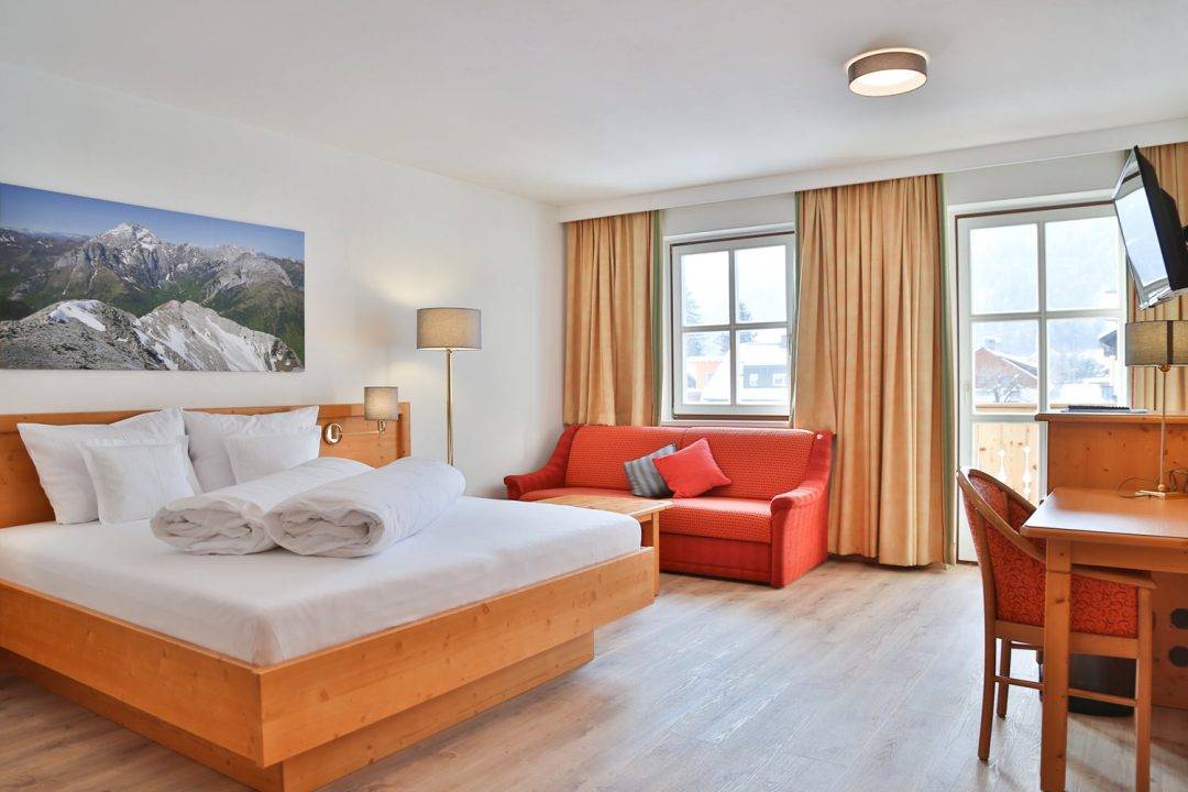 Herrliches „Wohlfühlzimmer“ 30m², mit einem separaten Wohnbereich mit Schlafcouch und einen eigenen Balkon. Den Sonnenaufgang im Bett und den Blick auf die Gailtaler Alpen Richtung Lesachtal und Gailbergsattel geniesen. Die hochwertigen Vollholzmöbel vom heimischen Tischler schaffen eine besondere Wohlfühl-Atmosphäre. Das Bett – etwas höher gestellt – ist ohne Bettende (auch für größere Gäste) und ist mit einer hochwertigen Matratze und Matratzenauflage ausgestattet.