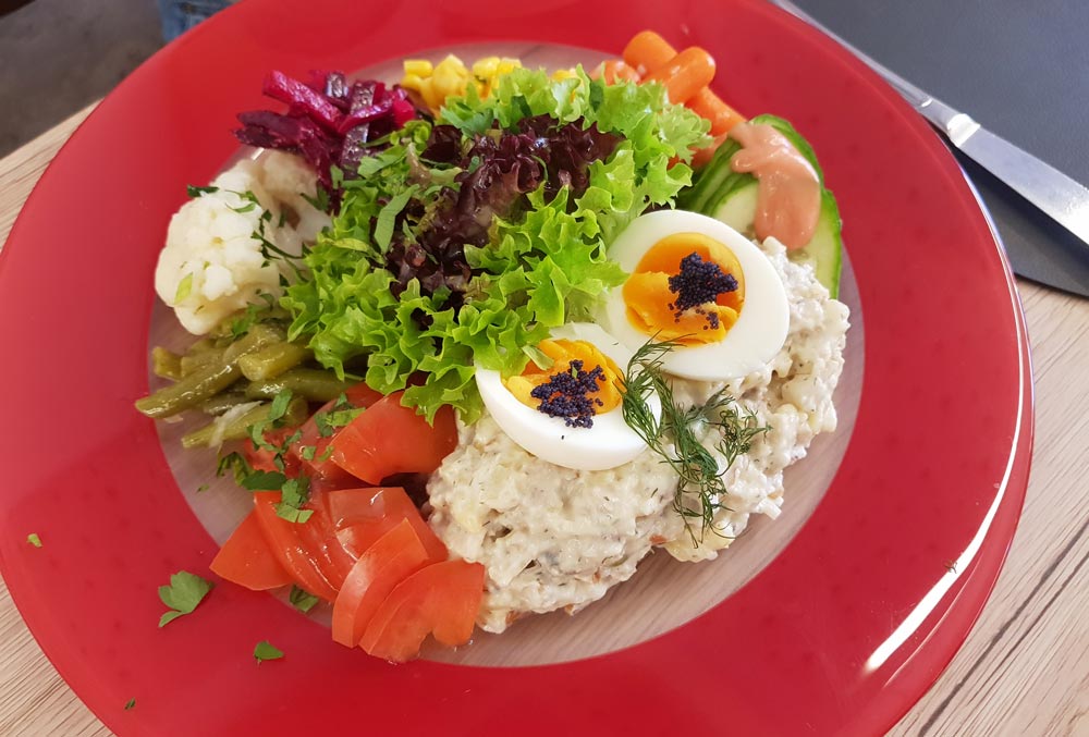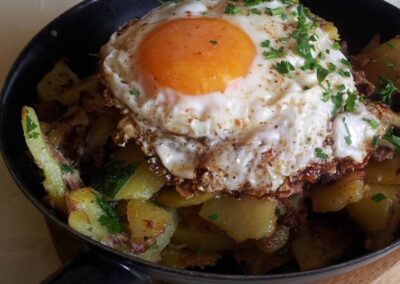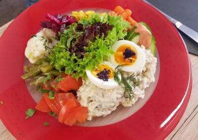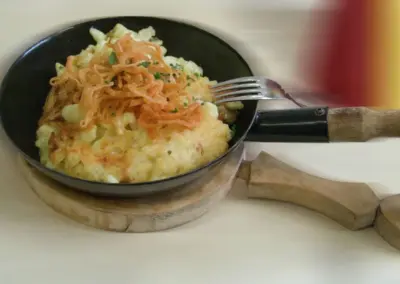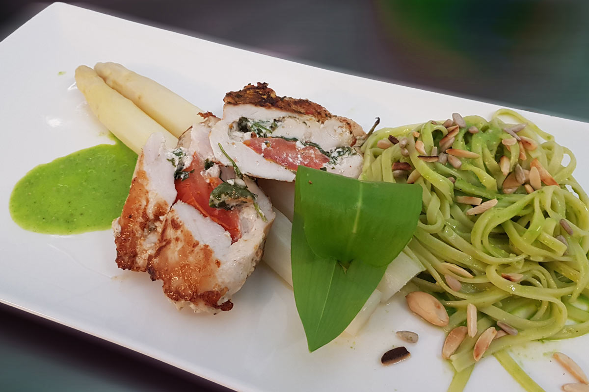 - Auch viel unserer anderen Lebensmittel werden vom heimischen Landwirt produziert. Dazu zählen z.B. Eier aus dem Wanderstall, Kärntner Kartoffeln, Gailtaler Almkäse, im Sommer die Salate und das Gemüse vom Gemüsebauer, Äpfel für unsere Strudel, natürlich auch der Lavanttaler Spargel oder das selbst fermentierte Kraut und die hausgemachten Marmeladen, die Milchprodukte aus Kärnten uvam.